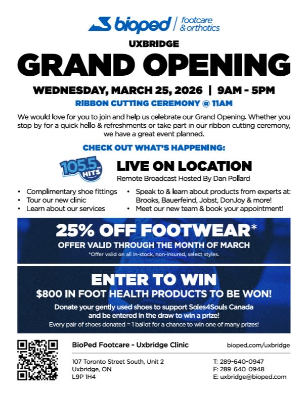 Join us for another Grand Opening in Uxbridge! BioPed Uxbridge is your local foot and lower‑limb care centre, offering custom orthotics, advanced footcare nursing, compression therapy, bracing, and supportive footwear solutions. Their multidisciplinary team of certified Pedorthists and Advanced Footcare Nurses provides thorough assessments and personalized treatment plans to relieve pain, improve mobility, and support long‑term foot health. Conveniently located on Toronto Street South, the clinic offers both regular and extended appointment hours to serve the Uxbridge and North Durham community 📍 BioPed Uxbridge — At a Glance2026 - GRAND Opening - BioPed (Uxbridge)
