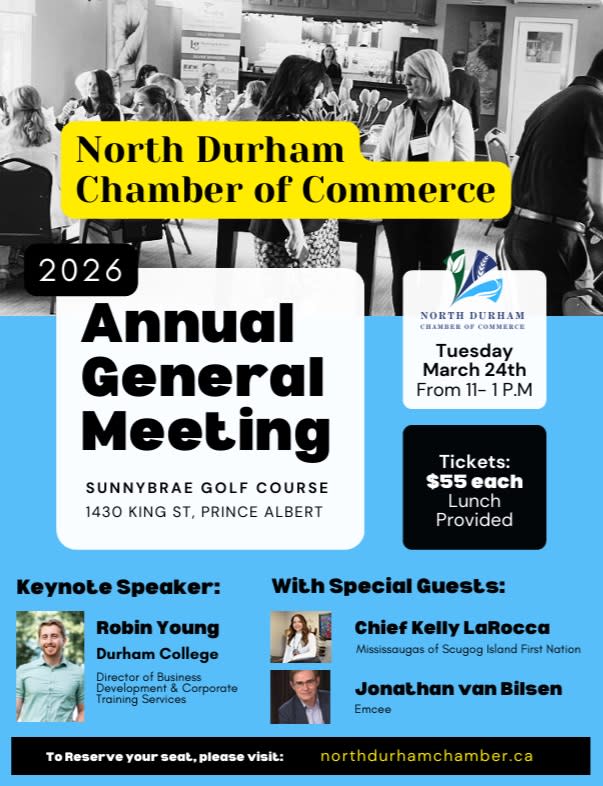 The North Durham Chamber of Commerce will convene its Annual General Meeting on Tuesday, March 24th, 2026 bringing together our membership, community partners, and regional stakeholders for an important review of the past year and a strategic look ahead. This annual gathering serves as a cornerstone of our governance and accountability, providing a transparent overview of the Chamber’s activities, financial position, advocacy efforts, and organizational progress. Attendees will hear updates from the Board of Directors, receive key reports, and participate in the formal business required to guide the Chamber’s continued success. The AGM also offers a valuable opportunity to reflect on the collective achievements of our business community and to reaffirm our shared commitment to fostering a vibrant, resilient, and prosperous North Durham. As we prepare for the year ahead, the insights and engagement of our members remain essential to shaping the Chamber’s priorities and strengthening our role as a champion for local business. We look forward to welcoming all members on March 4th and to continuing our work together in support of a thriving regional economy. **By providing your email address, you are granting us permission to send you email marketing communications. You’ll receive updates, exclusive offers, and relevant content. **If you require a mobility accommodation, please let us know.2026 - NDCC - AGM